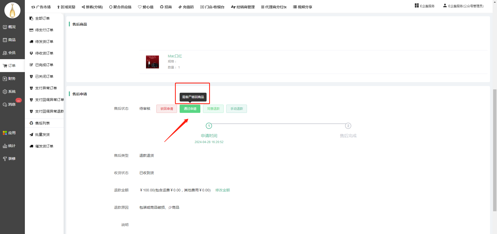 4、审核:要么选择驳回申请,要么选择同意退款(退款方式则原路返回,无则需要您用其他方式进行退款)