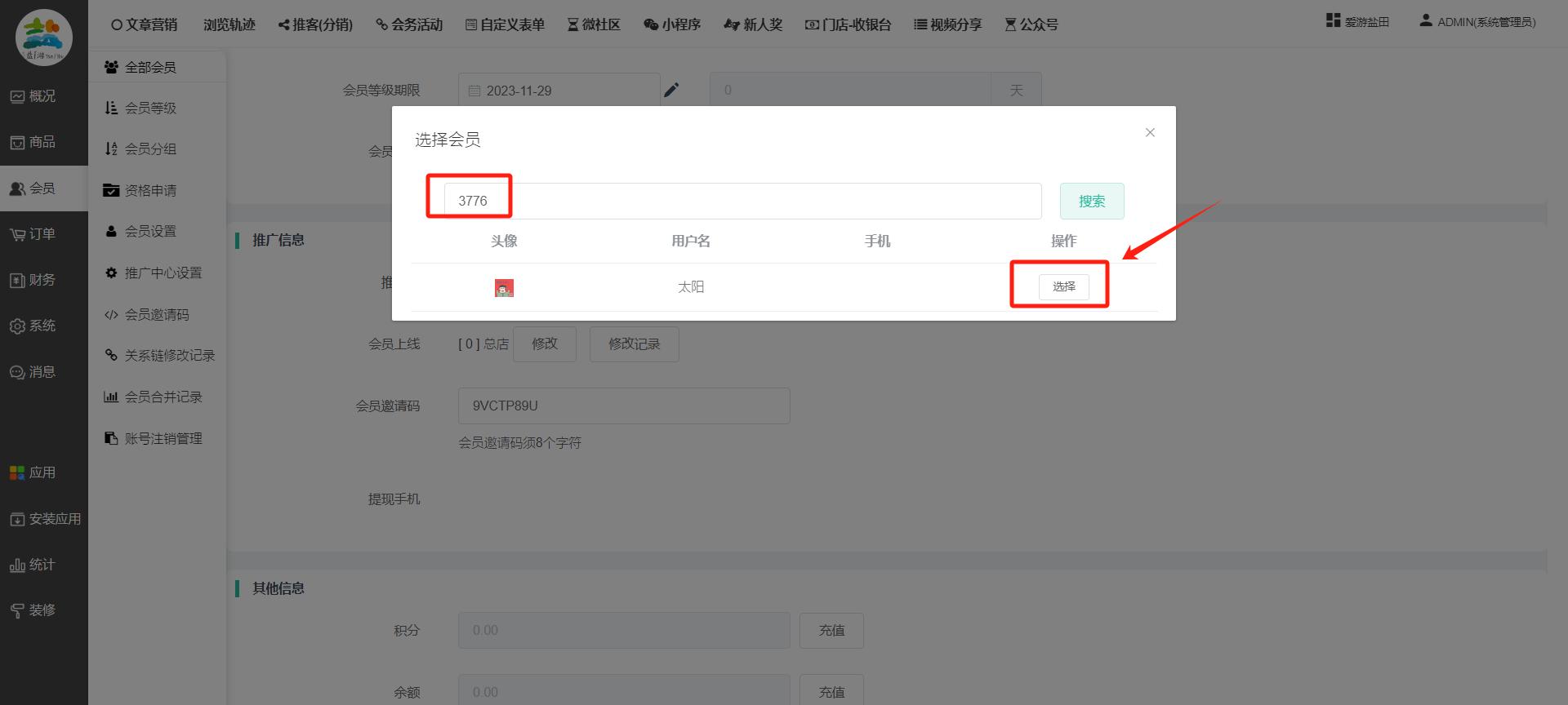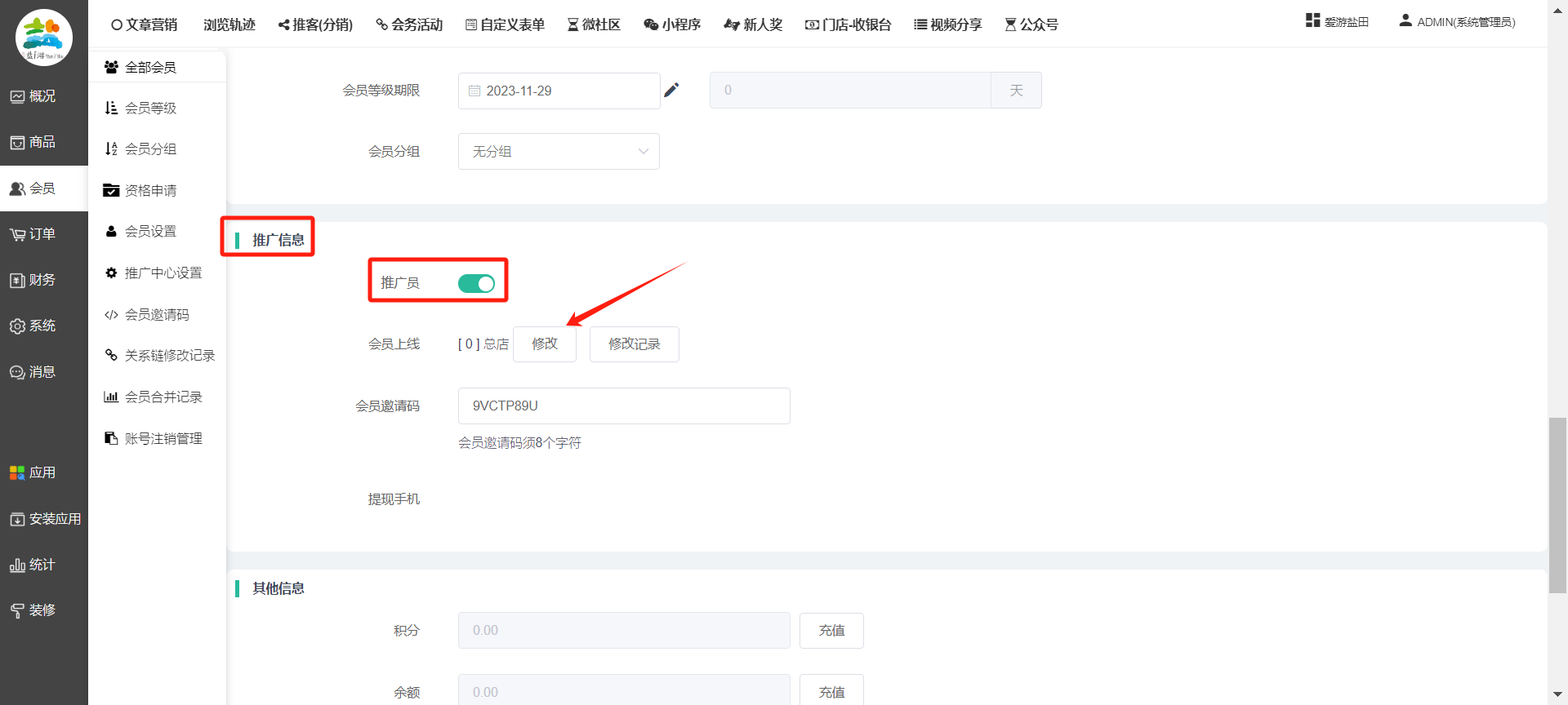 目录 搜索 展开 一、前期准备资料二、数字乡村码-上线操作指南1、服务号的申请流程及认证2、申请小程序流程3、开放平台绑定小程序和公众号三、数字乡村码-系统操作数字乡村码系统管理-概况数字乡村码-商品管理1、发布商品2、商品列表3、商品表单4、商品分类5、品牌管理6、配送模板7、评论管理8、优惠券管理9、商品标签10、退货地址设置11、满额优惠12、批量操作13、配送方式14、基础设置15、商品隐藏四、数字乡村码-会员管理1、全部会员2、会员等级3、会员分组4、资格申请5、会员设置6、推广中心设置7、会员邀请码8、会员关系链修改关系链修改记录9、会员合并记录10、账号注销管理11、会员设置中心五、数字乡村码-订单管理1、订单管理列表2、订单处理流程3、订单状态4、订单修改价格5、订单退款退货6、多包裹发货7、批量发货订单操作步骤8、催发货订单9、物流查询六、数字乡村码-财务管理1、余额设置2、会员余额3、充值记录4、转让记录5、余额明细6、收入明细7、提现设置8、提现统计9、积分管理10、转账审核11、收益广告12、批量充值七、数字乡村码-系统管理1、商城入口2、商城设置①、商城设置②、订单设置③、物流查询④、短信⑤、联系方式⑥、分类⑦、优惠券⑧、分享⑨、幻灯片⑩、广告位⑫、地图设置3、交易设置4、微信模板消息自定义消息模板(新版)自定义消息模板(旧版)小程序消息模板公众号模板消息变更公告5、语言设置6、权限管理7、多媒体管理八、数字乡村码-消息管理九、数字乡村码-应用管理十、数字乡村码系统-数据统计十一、数字乡村码-页面装修DIY1、模板管理2、店铺页面3、顶部导航4、底部导航5、DIY模板市场6、首屏广告7、基础设置8、装修DIY尺寸建议十二、供应商功能插件操作指南1、供应商2、门店-收银台门店申请和使用步骤门店管理①、门店-收银台 营销设置②、门店-收银台 分润设置门店分类门店申请门店审核门店商品门店商品订单收银台订单数据统计核销员基础设置默认设置门店装修3、微社区4、会务活动十三、营销插件操作指南活动报名提货卡新人奖微店问卷调查积分视频分享1、视频分享基础设置2、视频分享发现管理3、视频分享分类管理4、视频分享评论管理5、视频分享分红记录6、视频分享短视频中心每日红包幸运大抽奖签到优惠券二维码任务奖励优惠劵文章音频文章付费文章限时购新海报拓客卡操作流程积分活动素材中心视频红包十四、入驻门店应用类1、门店预约2、附近商品3、门店定位设置4、门店控制5、门店满额包邮6、门店满额减7、导入商品8、门店搜索9、门店股东10、核销券11、多门店核销1、商城后台设置2、前端功能演示十五、常见问题1、后台登录密码修改流程2、会员-余额,积分,后台如何进行充值与扣除3、如何修改上下级关系4、一种万能的获取商城小程序路径的方法 暂无相关搜索结果! 阅读次数:2100 本文档使用 模王系统 发布 8、会员关系链修改 8、会员关系链修改一.如何修改上下级关系?1.会员-全部会员-可以通过搜索用户的独立ID,或者用户微信昵称,找到此会员,然后点击右边的(操作)2.再点击会员详情。3.滑到下面,有个推广信息-会员上线,点击修改4.输入上级的ID号,点击搜索,出来此上级会员后点击选择。5.滑到最下面,一定要点击提交按钮。文档更新时间: 2023-11-30 14:56 作者:链上旅行
